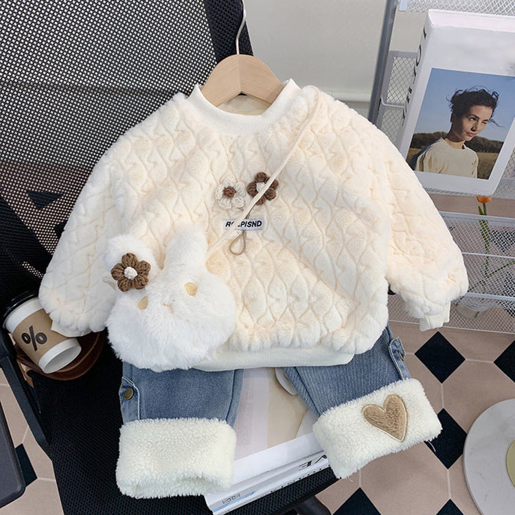 Cute Girls' Plush Bunny Two-piece Sweater and Jeans Set