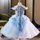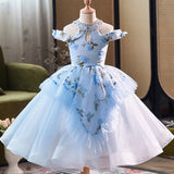 Blue Princess Dress with Flower Embroidery Birthday Dress