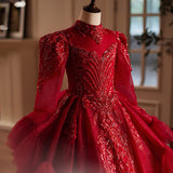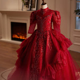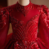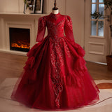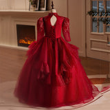 Elegant Baby Girls Red Patterned Long Sleeve Beaded Mesh Puffy Princess Dress Toddler Party Dress